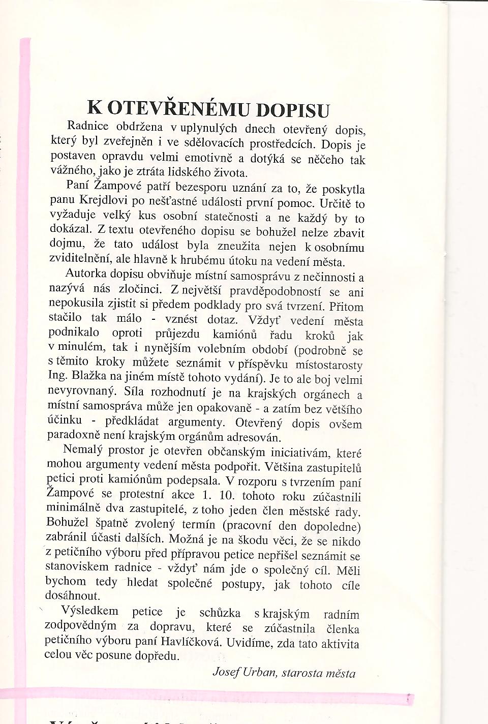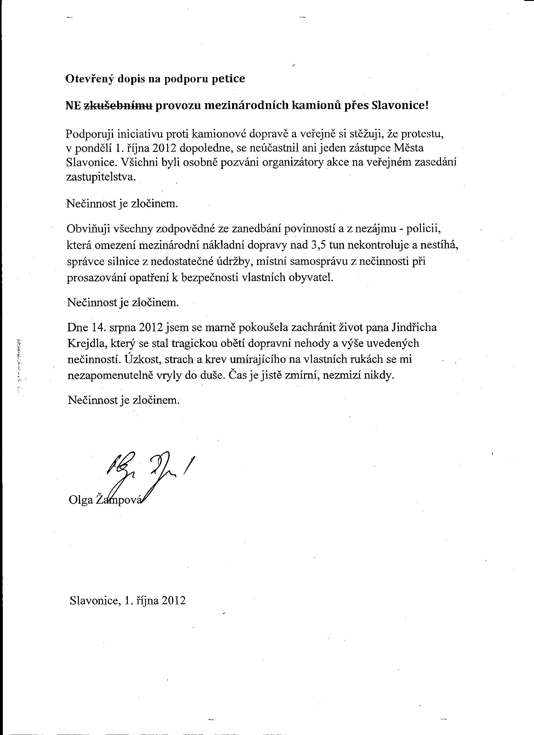V posledním čísle slavonických novinek (říjen 2012) se pan starosta Urban vyjádřil k mému otevřenému dopisu na podporu petice NE zkušebnímu provozu mezinárodních kamionů přez Slavonice. Protože nebyl otevřený dopis spravedlivě publikován vedle článku pana starosty Urbana, vyrovnávám tuto nesrovnalost a publikuji svůj otevřený dopis společně s textem pana starosty.